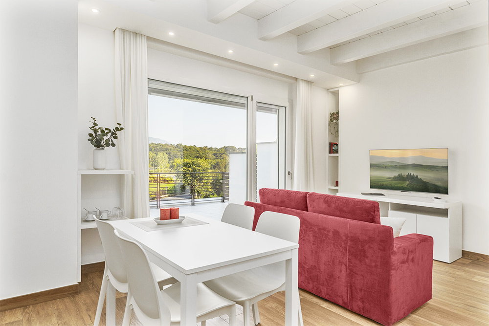 dotazione di base della cucina – frigo – bollitore – macchina del caffè – tavolo con sedie – divano letto – scrivania – TV 43° in sala e 32″ in camera – armadio – cassaforte – kit pronto soccorso – biancheria da letto e da bagno – asciugacapelli – linea cortesia – WiFi gratuito – aria condizionata – riscaldamento